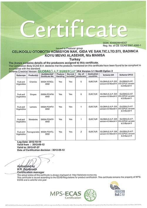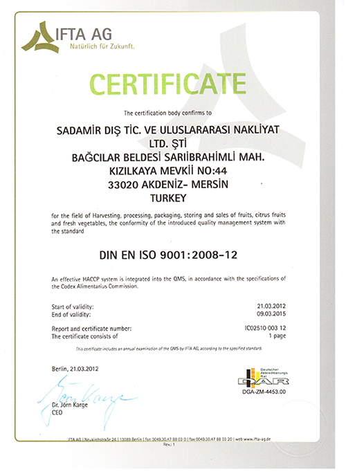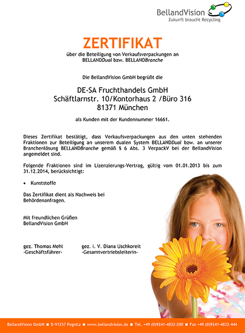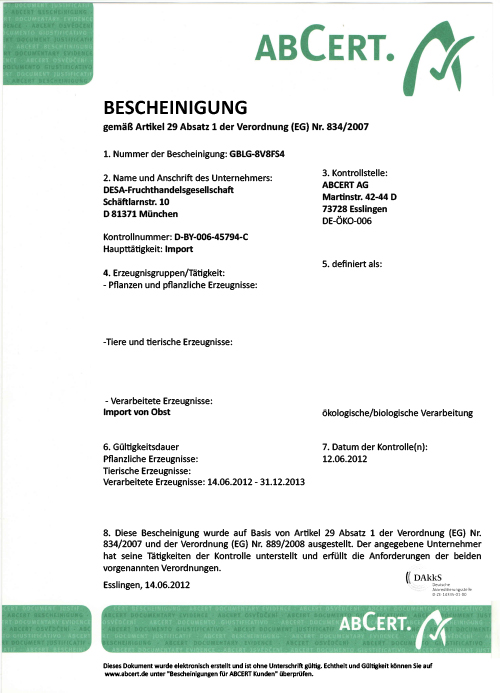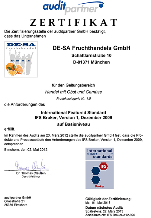 Die Firma DE-SA Fruchthandels GmbH ist IFS Broker und BIO zertifiziert. QS-Zertifizierung in Vorbereitung.